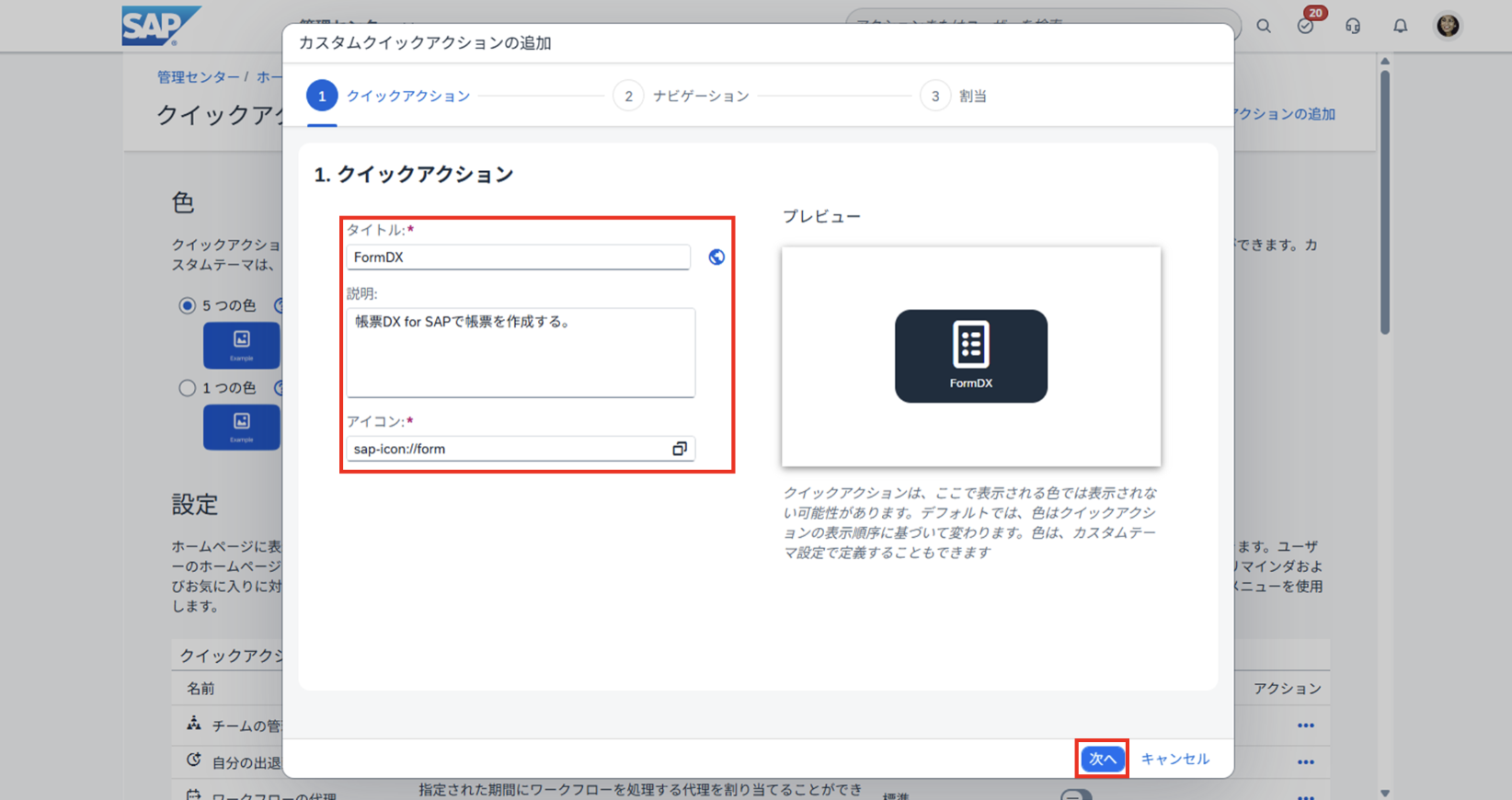 3. クイックアクション情報を入力し、[次へ] ボタンをクリックする。
