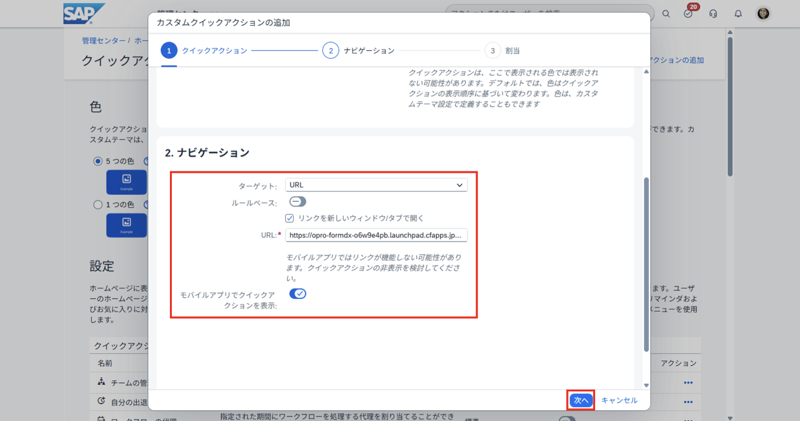モバイルアプリでクイックアクションを表示任意 (モバイルアプリで表示したい場合はチェック)