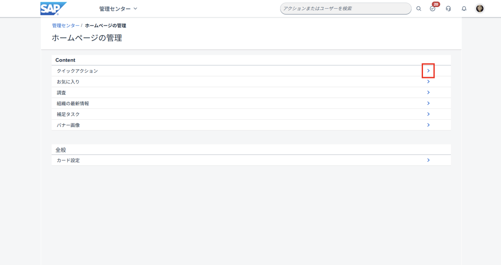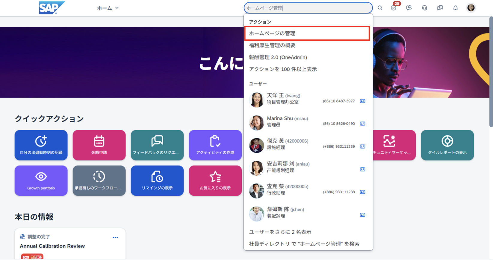 1. SuccessFactors トップ画面の検索ボックスで "ホームページ管理" を検索、選択する。
