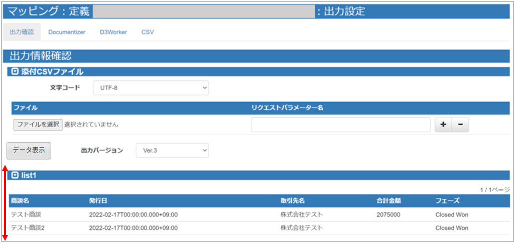 [出力確認]タブで取得できているデータの画面キャプチャ(出力時にデータが表示されない場合) [出力確認]タブの使用方法については 【ViewFramer】マッピングの[出力確認]タブについて(Salesforce) をご参照ください。