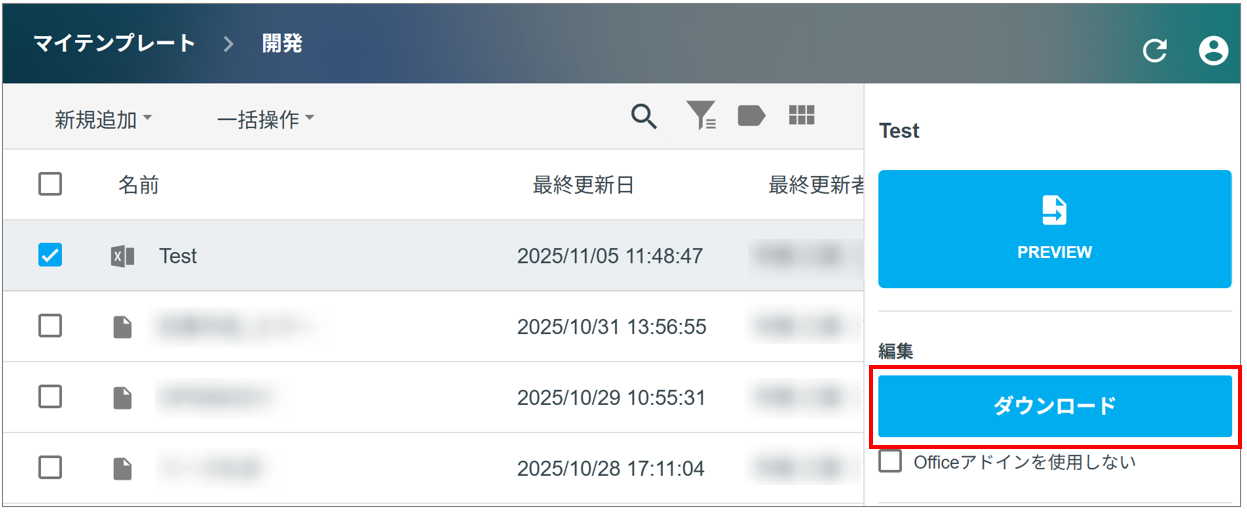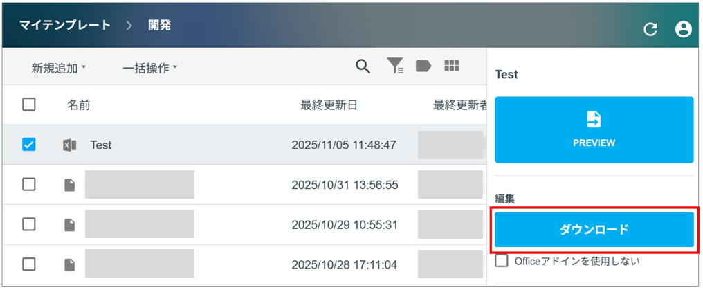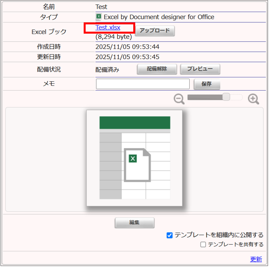 事象が発生しているテンプレートのエクスポートファイル(Excel/Word/PowerPointの場合)デザイン画面の赤枠部分を押下すると、配備中のテンプレートファイルをダウンロードすることができます。