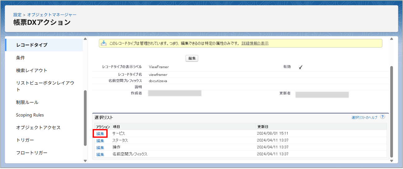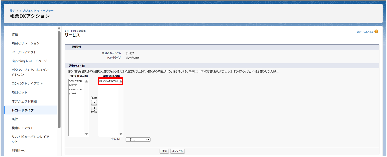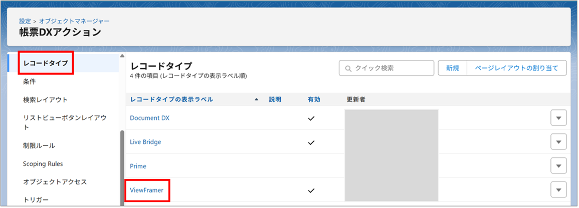 「帳票DXアクション」のオブジェクトマネージャーにて、「レコードタイプ」>「ViewFramer」を開きます。