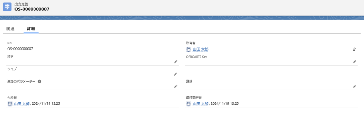 項目 設定値 備考 レコードタイプ ViewFramer サービス Viewframer(XA) 有効 true OPROARTSキー XLA 出力定義 ダミーレコード 必須項目のためレコードを選択してください。どのレコードを選択しても出力結果に影響ありません。 -