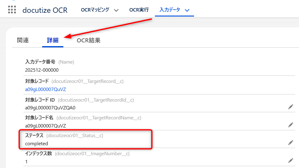 OCR実行後、「確認完了」をクリックするとこのステータスになります。