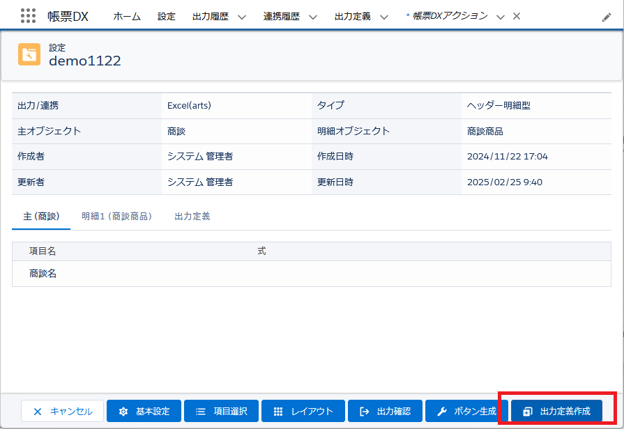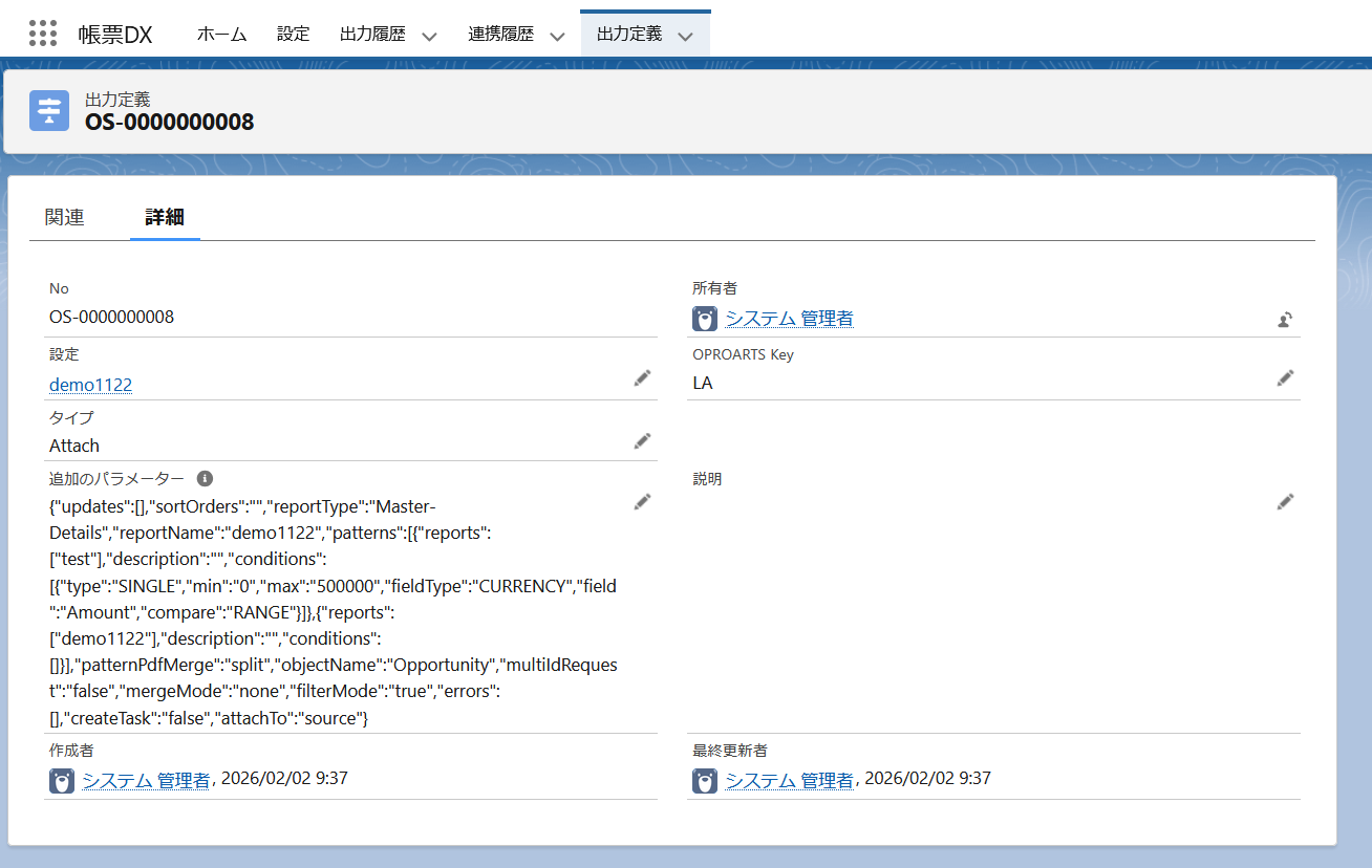 「出力定義を確認」ボタンをクリックして、生成された出力定義レコードの内容を確認してください。
