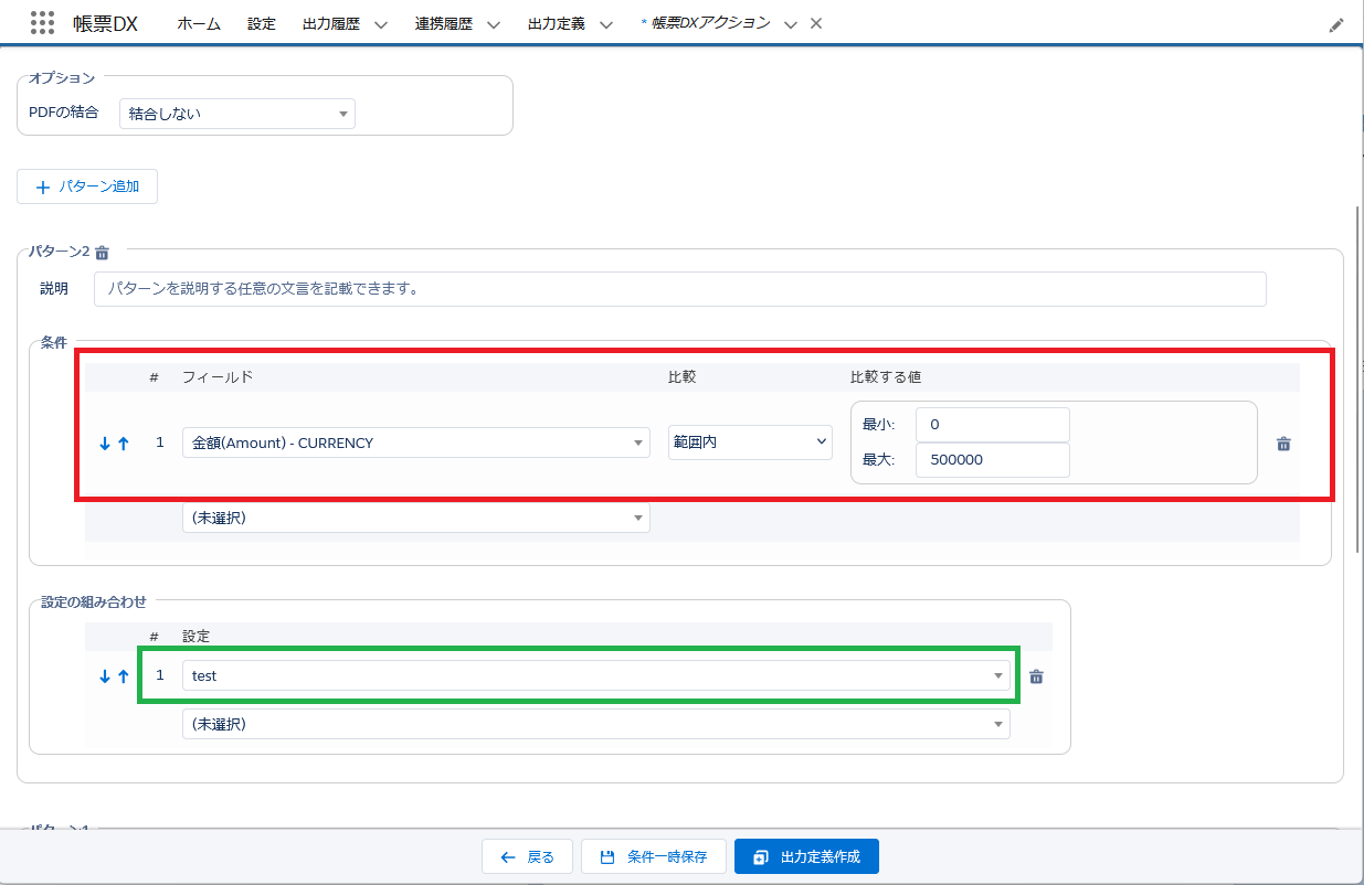 例として、主オブジェクト(商談)の金額項目が 500,000 以下であればパターン 2 の、それ以外の時はパターン 1 の設定レコードを使って帳票生成するという分岐を設定できます。