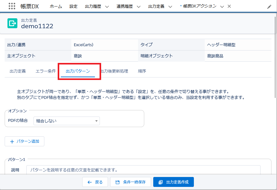 - 「出力定義」タブが開きます。このタブの設定は、「【帳票DX for Salesforce】帳票DXアクションの設定方法」の【3.「出力方法」「活動履歴作成」を選択します】を参考に設定してください。