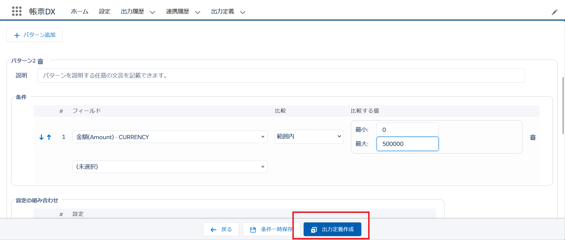 パターンごとの条件設定ができたら、「出力定義作成」ボタンをクリックしてください。