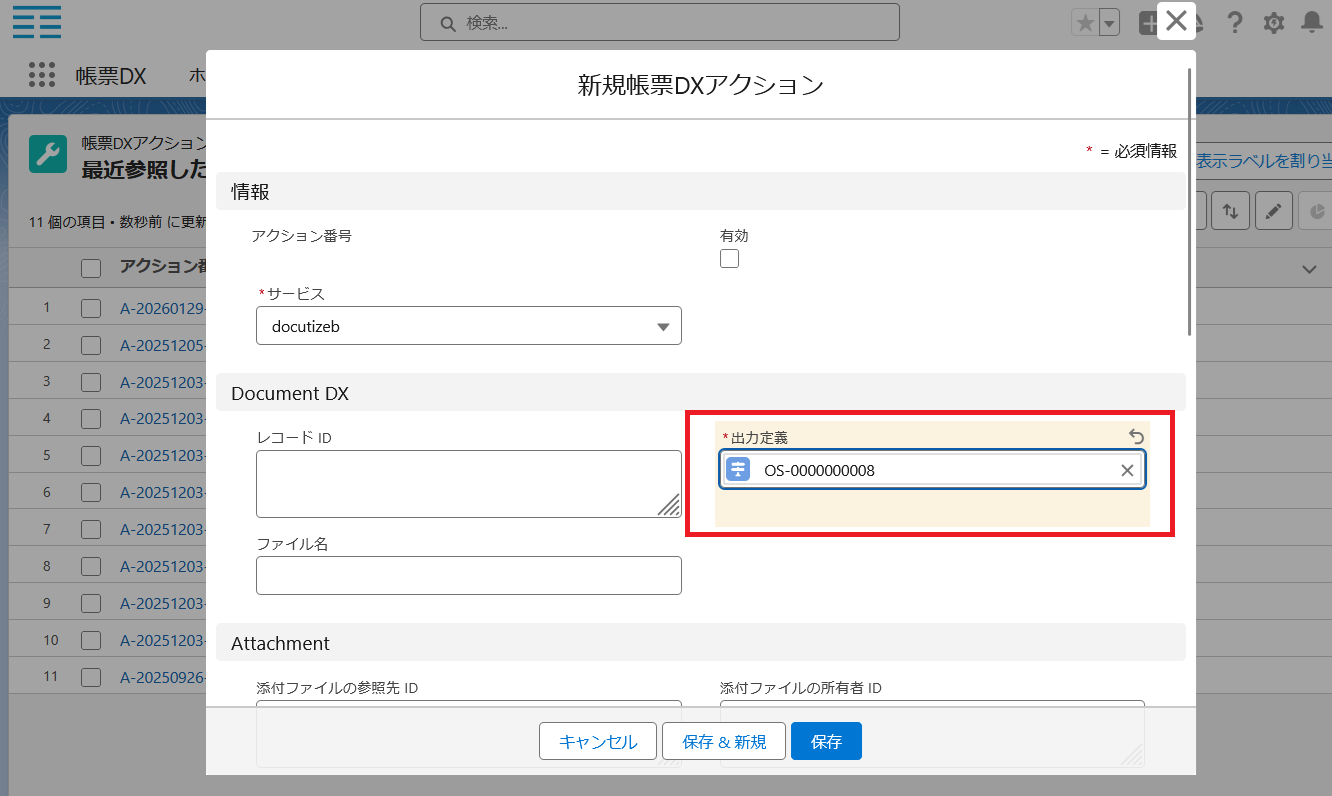詳細な手順については、「【帳票DX for Salesforce】帳票DXアクションの設定方法」を参照してください。