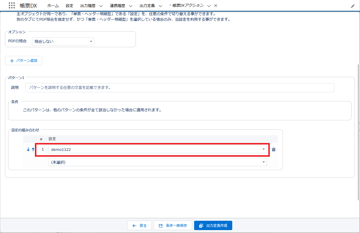 パターン 1 の枠内で複数の設定レコードを選択することで、パターン 1 のときに複数の帳票を結合したPDFを出力することも可能になります。