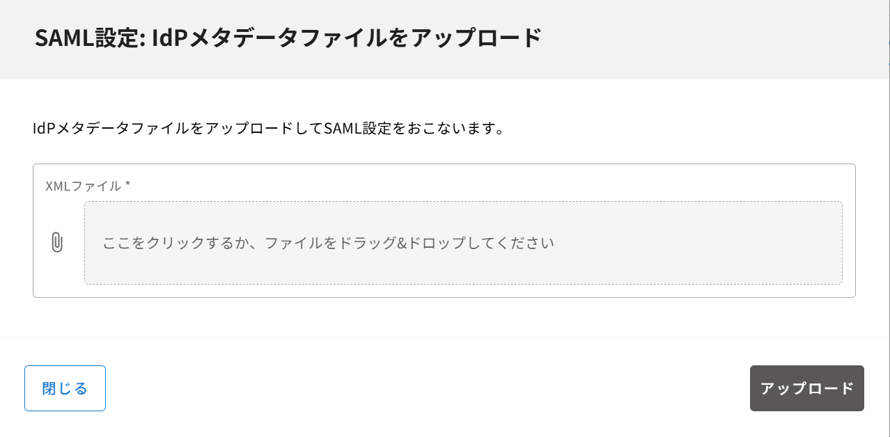 - 「IdPメタデータファイルをアップロードする」ボタンをクリックしてアップロード画面を開き、