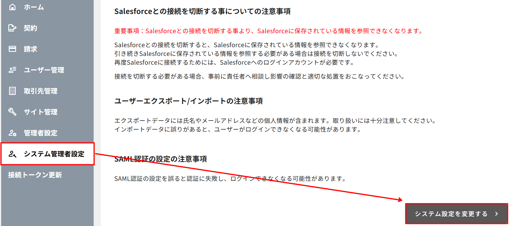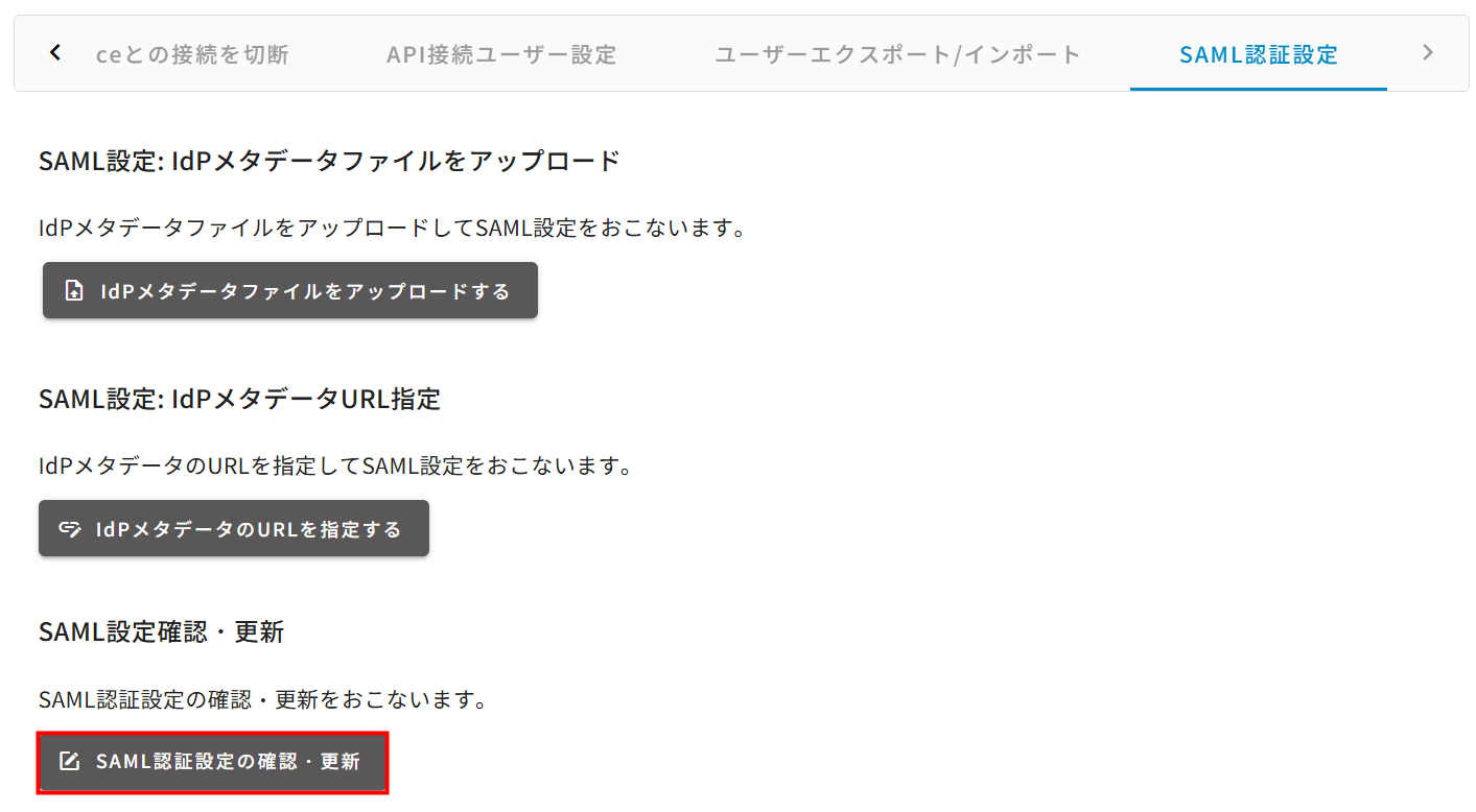 - システム管理者設定の「SAML認証設定」タブを開き、「SAML認証設定の確認・更新」ボタンをクリックします。