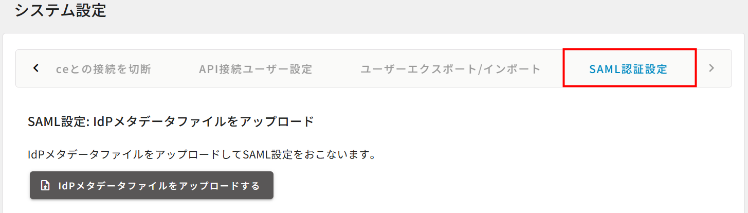 - ①IdPメタデータURLを指定して設定する方法と同様の手順でシステム管理者設定の「SAML認証設定」タブを開きます。