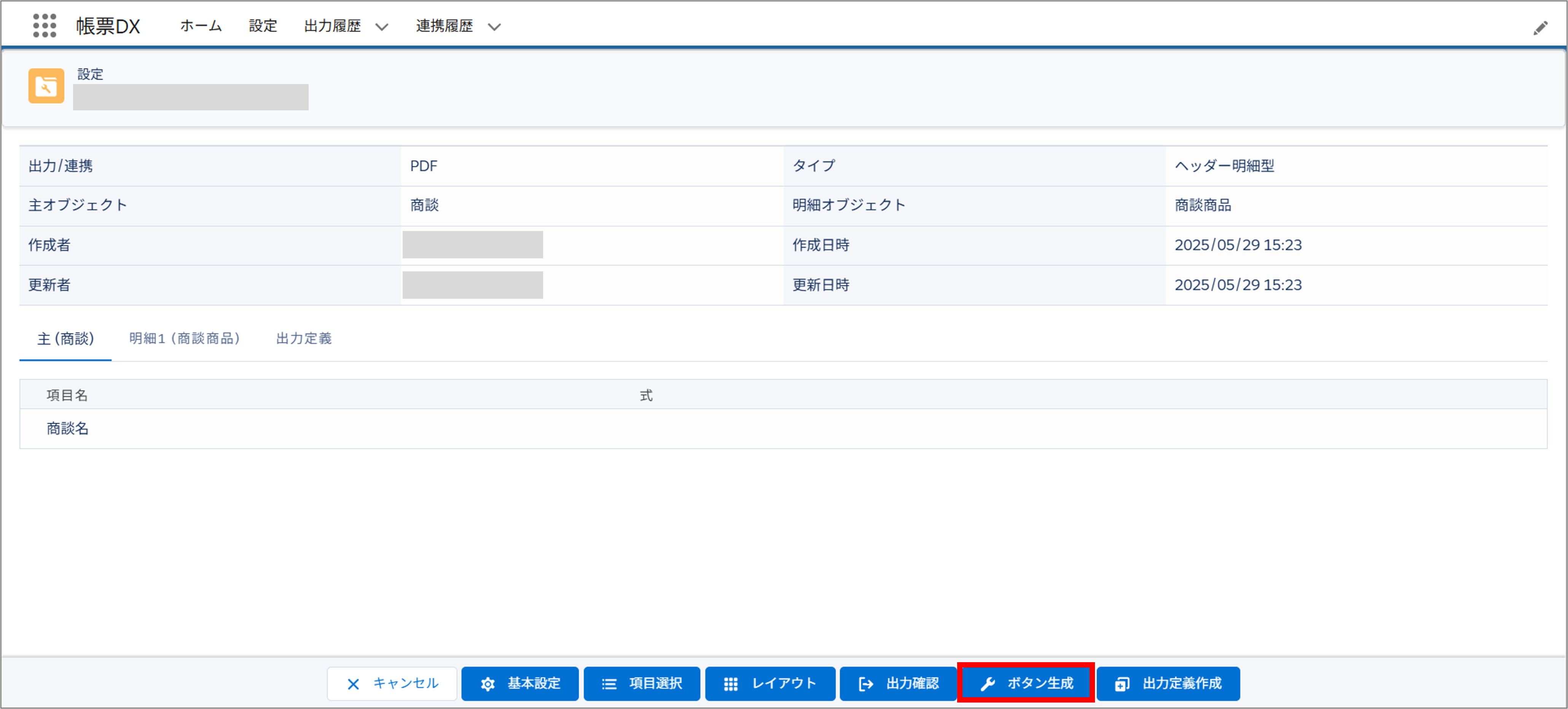【帳票DX for Salesforce ユーザガイド(3)】帳票作成 で作成した帳票設定の画面で、「ボタン生成」ボタンをクリックします。