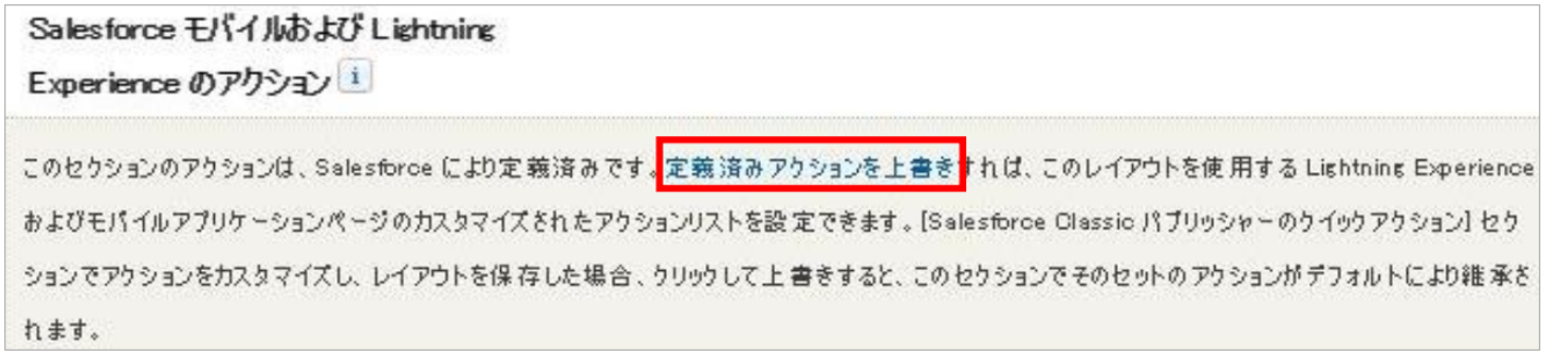 💡補足「Salesforce モバイルおよび Lightning Experience のアクション」に「定義済みアクションを上書き」の表示がある場合は、このリンクをクリックしてください。