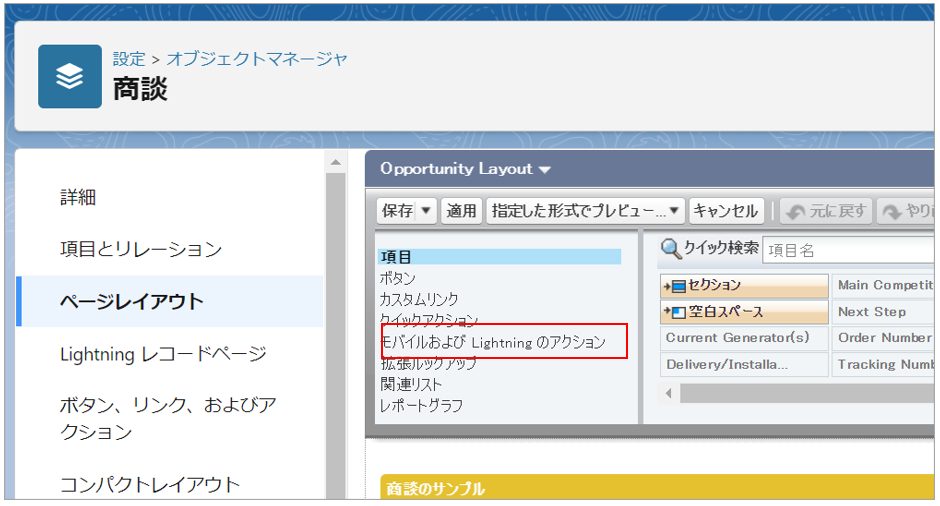 「モバイルおよび Lightning のアクション」をクリックします。