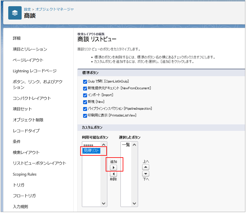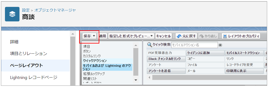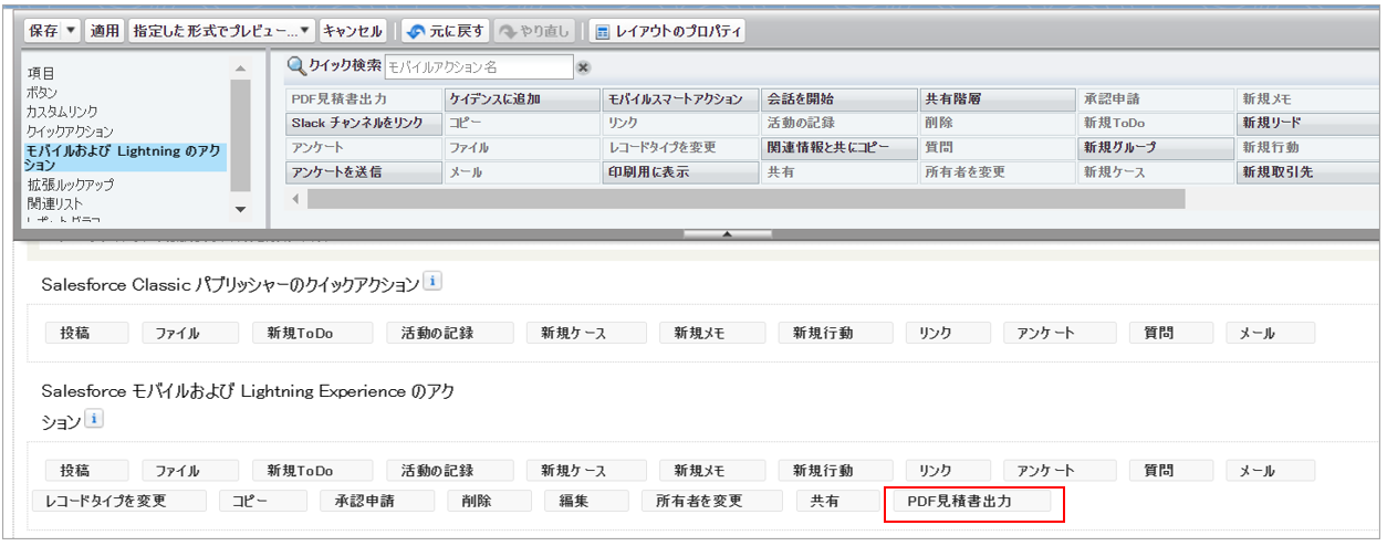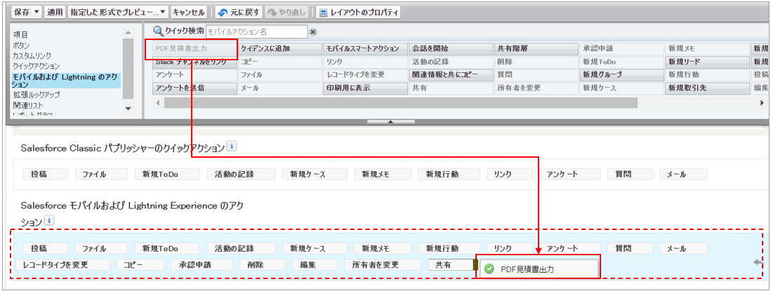 作成したボタンを一覧から「Salesforce モバイルおよび Lightning Experience のアクション」にドラッグ&ドロップで移動します。