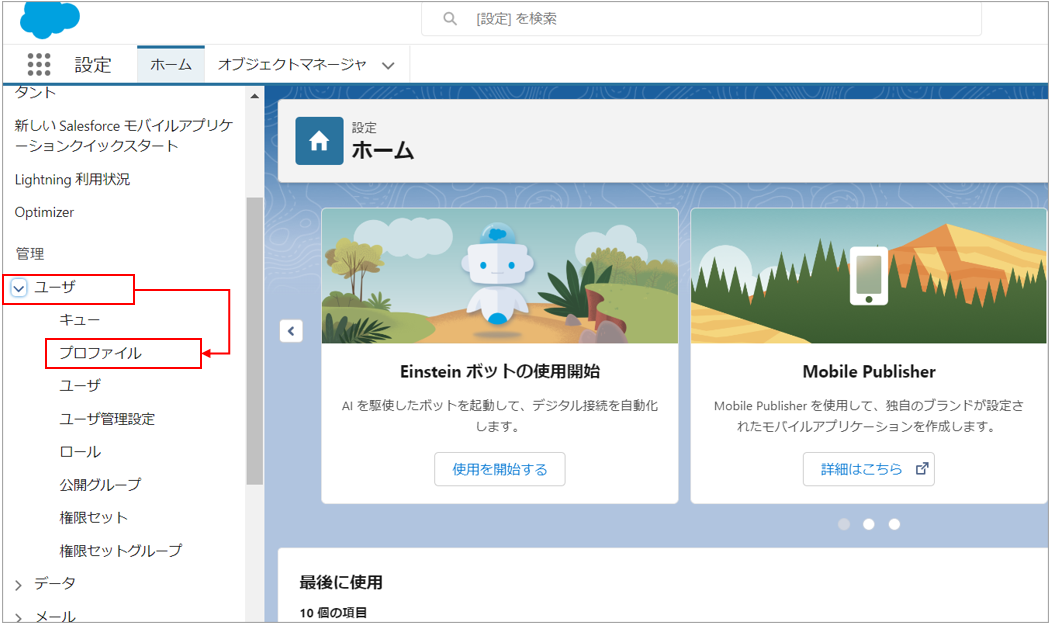 設定の「ホーム」タブから「ユーザ」>「プロファイル」をクリックします。