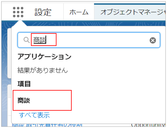 検索で「商談」と入力し、「商談」をクリックします。