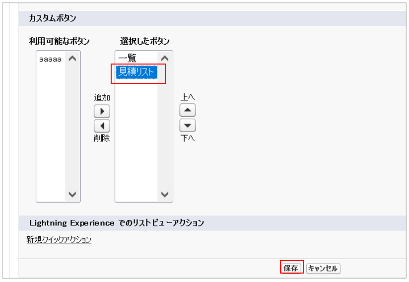 作成したボタンに対応するVisualforce ページを、「利用可能なVisualforceページ」から「有効化されたVisualforceページ」に追加して「保存」ボタンをクリックします。