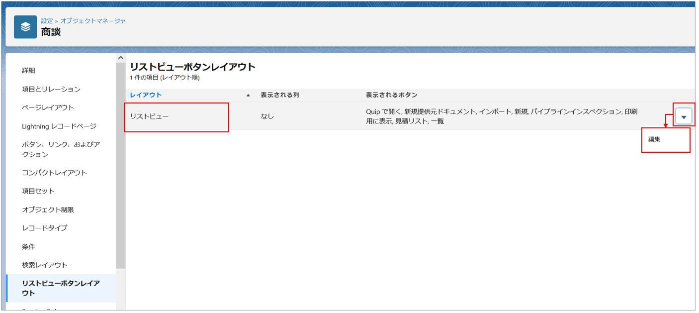 「リストビューボタンレイアウト」画面に遷移します。「リストビュー」の「▼」>「編集」をクリックします。
