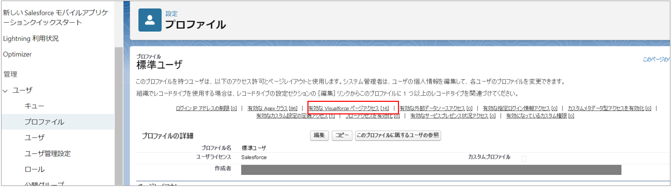 「有効なVisualforceページアクセス」をクリックします。