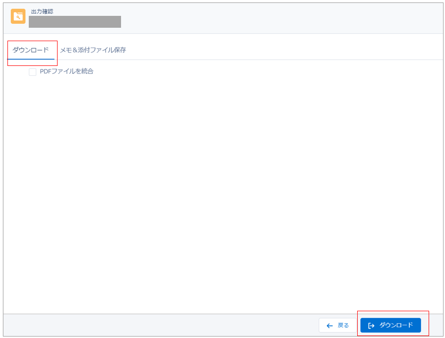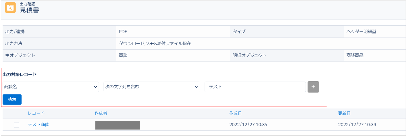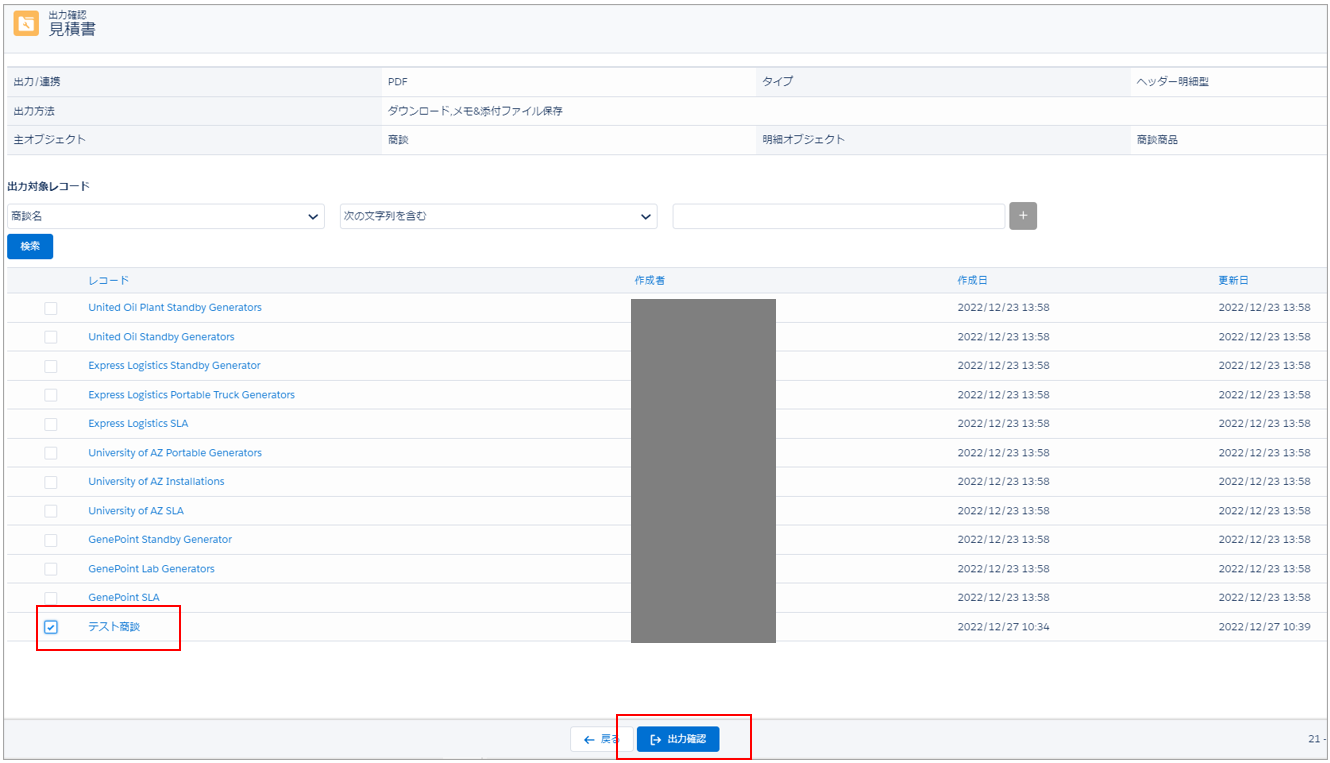 出力する主オブジェクトのレコードにチェックを付け、「出力確認」ボタンをクリックします。