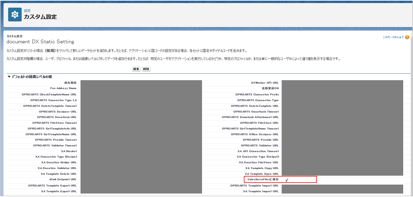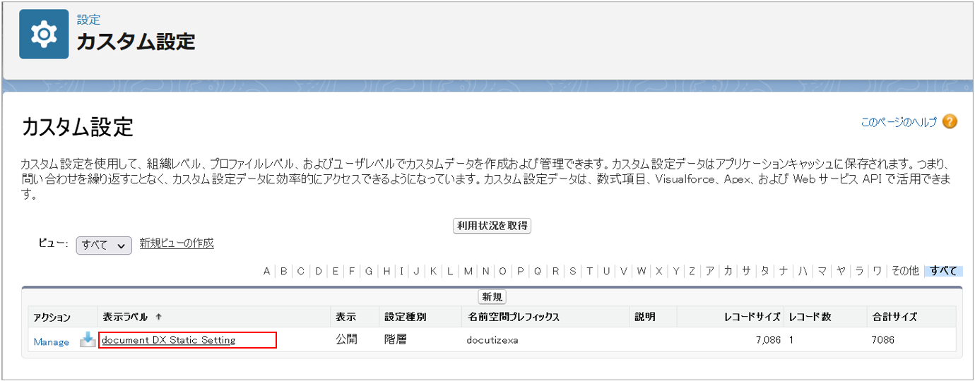 Salesforce設定画面から「カスタム設定」を選択し、「document DX Static Setting」をクリックします。
