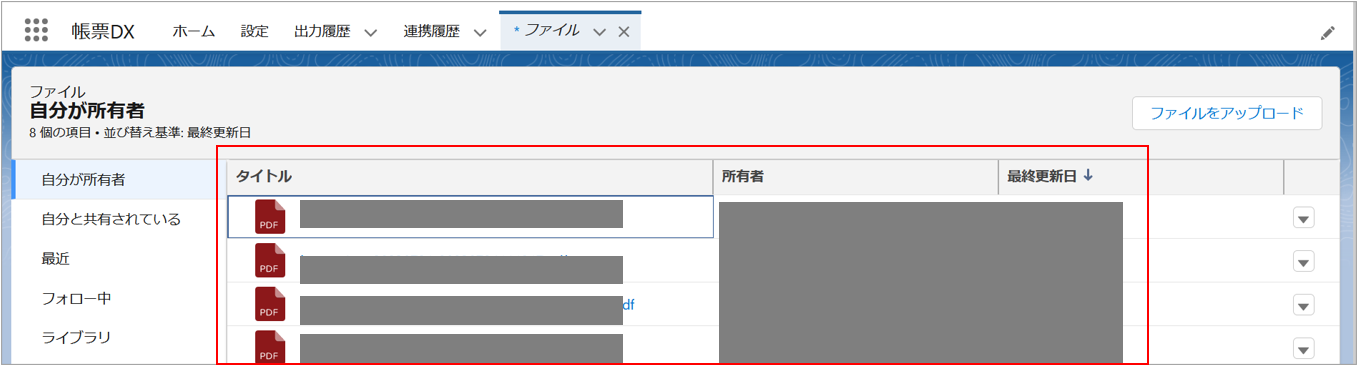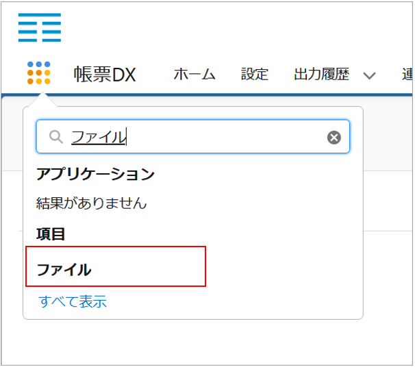 設定のボタン生成画面で「メモ&添付ファイルに保存」を選択し、Salesforce画面に設置したボタンから帳票を出力した後に、「ファイル」オブジェクトを確認します。 アプリケーションランチャーより「ファイル」を選択します。