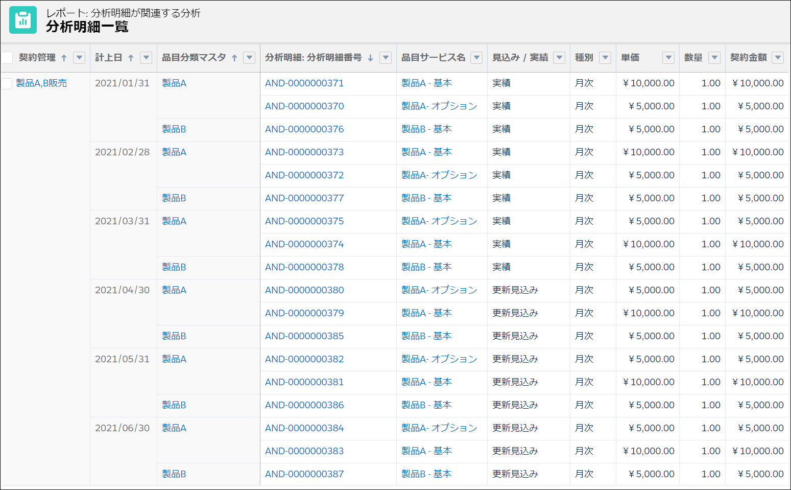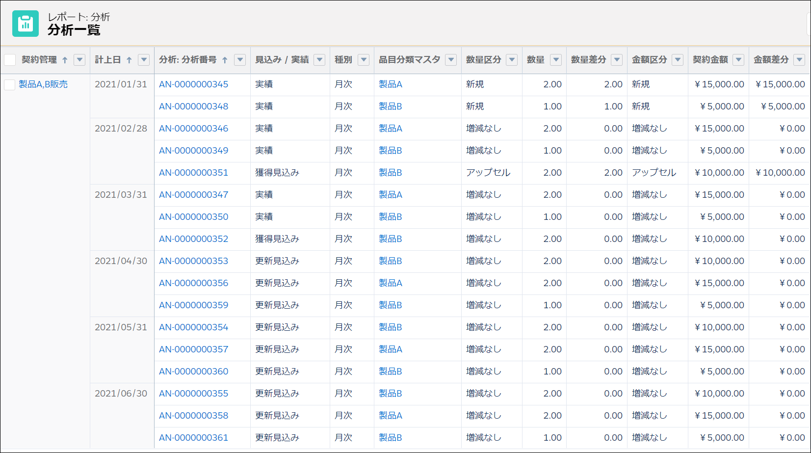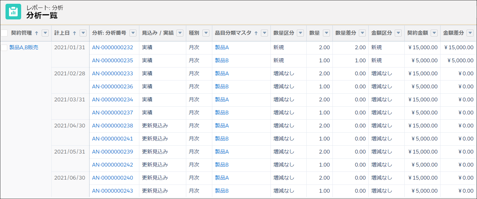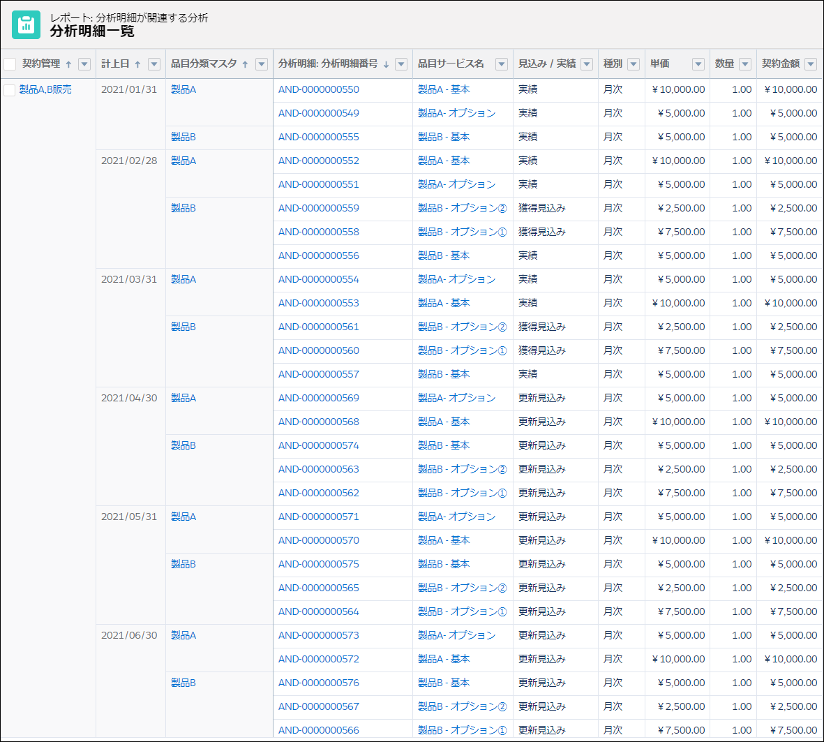 また「契約自動更新」項目がtrueであるため、同じ数量・金額の更新見込みの分析レコードが作成されています。