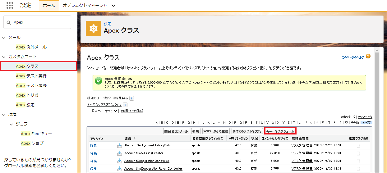- 設定画面のクイック検索ボックスに「Apex」と入力し「Apexクラス」をクリックしたら、開いた画面で「Apexをスケジュール」ボタンをクリックします。