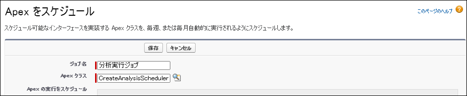 - お好みのジョブ名(ここでは「分析実行ジョブ」)を入力し、Apexクラスに「CreateAnalysisScheduler」を選択します。