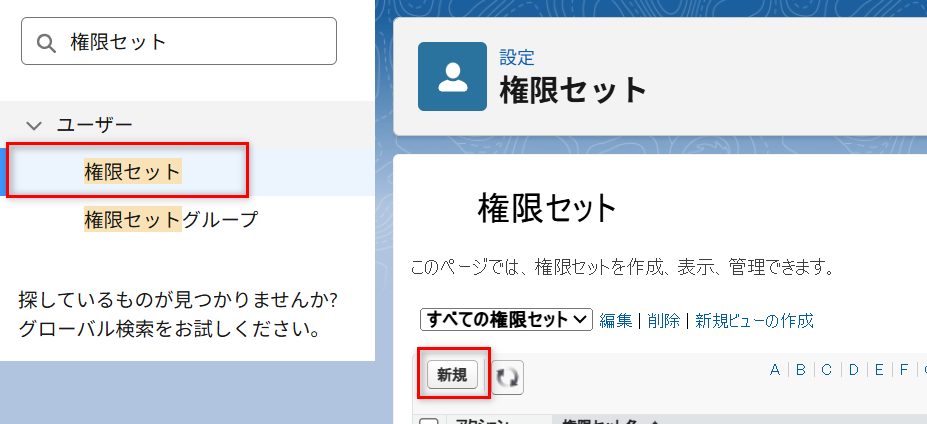 1.[設定]から、[クイック検索]ボックスに「権限セット」と入力し、「権限セット」を選択します。
