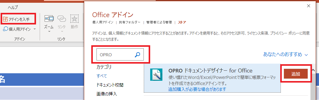 「挿入」タブの「アドインを入手」からアドインストアを開き、「OPRO」と検索すると出てきますので、追加します。