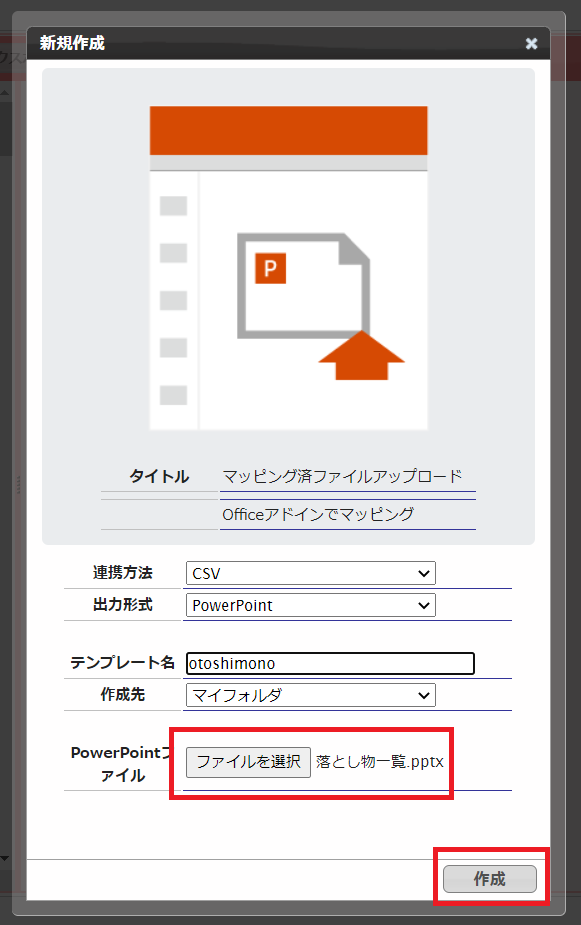 テンプレート名を付けて先程保存したPowerPointファイルを添付し、「作成」をクリックします。