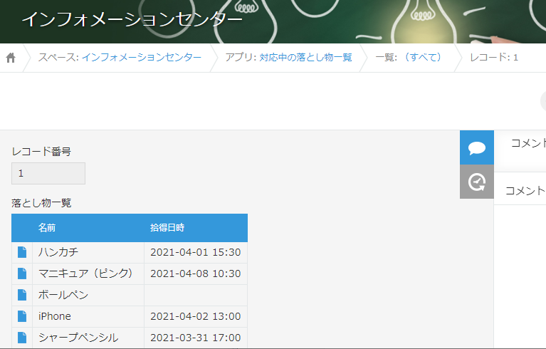 上記の設定で、「対応中の落とし物一覧」というダミーの親アプリに、「落とし物・迷子管理アプリ」の対応中のレコードを紐づけることができました。