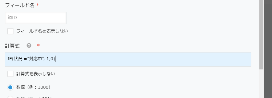 計算式の内容は以下と設定します。対応中のレコードは「1」、それ以外のレコードは「0」というデータが入るフィールドになります。