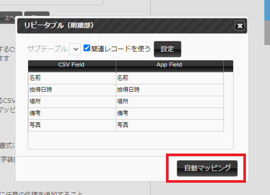 PowerPointのアドインで設定したフィールド名と、「落とし物・迷子管理アプリ」のフィールド名が同じものが自動的に紐づきます。