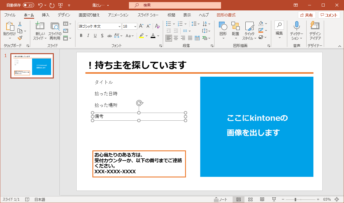 印刷して掲示して落とし主を探すタイプで、本体の1スライドのみのレイアウトです。