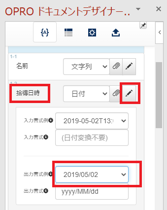 「拾得日時」の部分をクリックして、出力書式をPowerPoint上で表示したい形式に変更します。