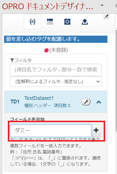 TD1の「フィールドを追加」に、「ダミー」と入力して+ボタンをクリックして、ダミーを追加します。