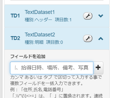 TextDataset2の「フィールドの追加」欄に、kintoneのアプリから出力したいフィールドコード(名前、拾得日時、場所、備考、写真)を入力して、「+」をクリックするとフィールドが作成されます。