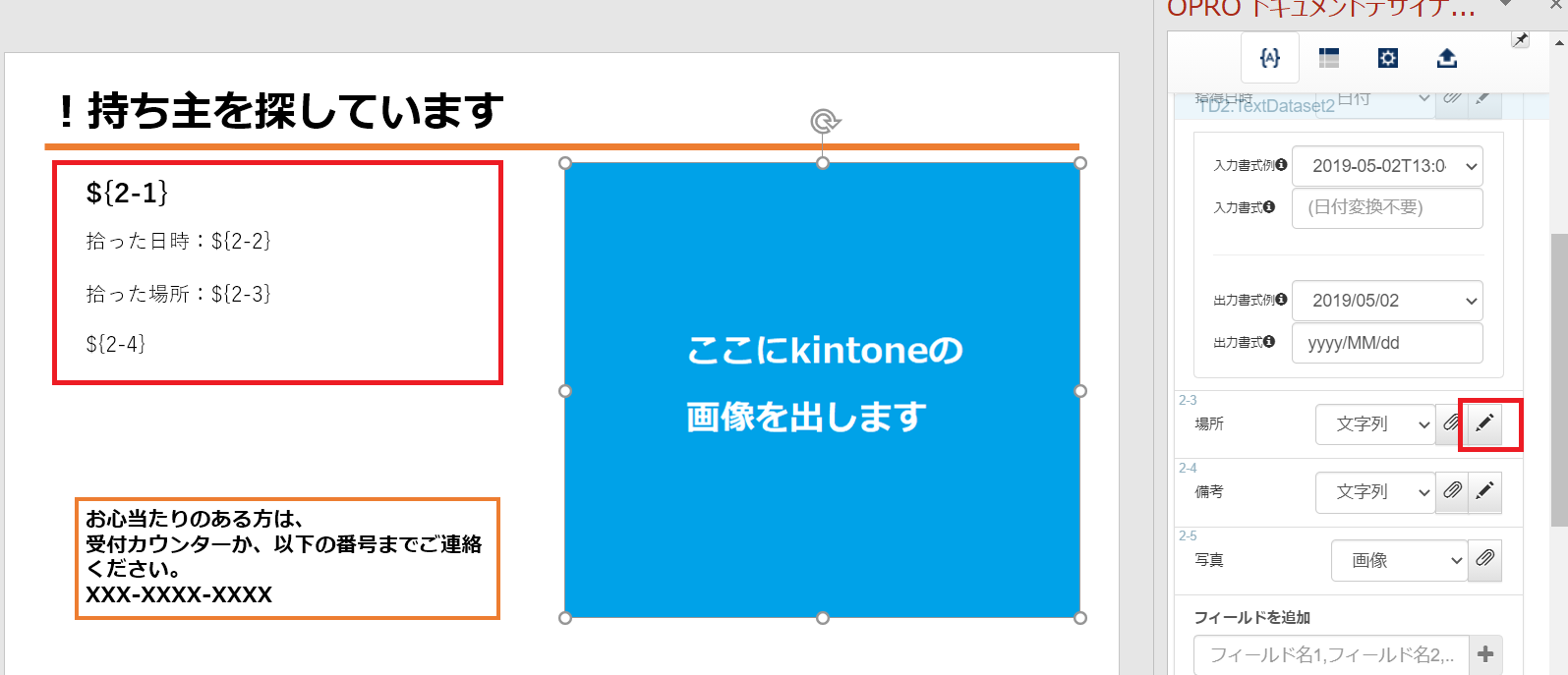 kintoneのデータを出力したい部分にカーソルを入れて、「名前」「拾得日時」「場所」「備考」の鉛筆マークボタンをクリックして、それぞれタグを入れます。