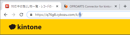 帳票に使用するアプリのアプリIDを確認して控えておきます。以下の例だと、「対応中の落とし物一覧」アプリのIDは「9」です。