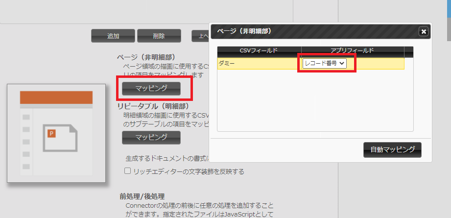 ⑤ページ(非明細部)の「マッピング」ボタンをクリックして、ダミーフィールドに適当なアプリフィールドを紐づけます。