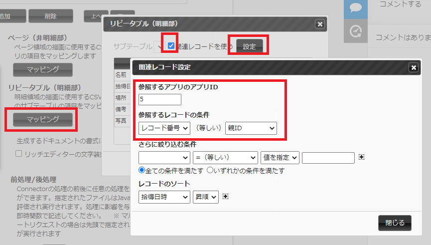 ⑥リピータブル(明細部)「マッピング」ボタンをクリックして、「関連レコードを使う」にチェックを入れて「設定」をクリックすると、関連レコード設定(③に入力したkintone以外のアプリを使用する設定)画面が開きます。