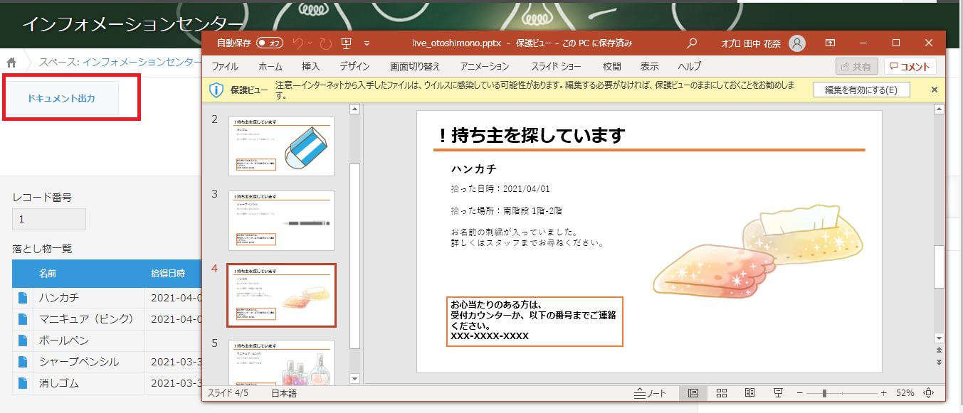 1つの落とし物レコードが1スライドに割り当てられて、複数のスライドになりました。